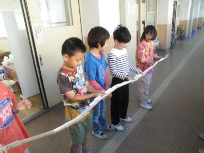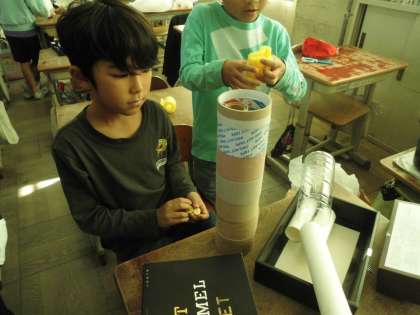 トイレットペーパーの芯を使って、長い迷路を作っている人は、友達と協力して玉を転がして、スムーズに転がるかを試しながら作っています。