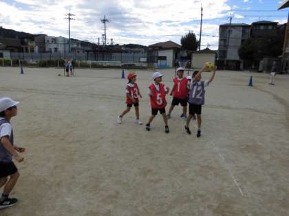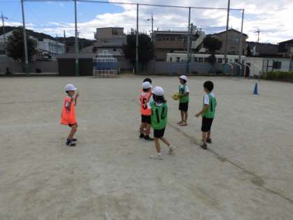 チームのみんなでパスをつなぎながらゴールを目指します。パスをうまくするためにはどうすればいいかなどを考えてプレーしています。