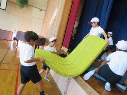 体育科では、マット運動の学習を行っています。準備、片付けもみんなで協力し合って、取り組んでいます。「誰か、ここを持って!」「ぼくは、〜するからここをお願い!」など、声を掛け合う姿が素晴らしいです。
