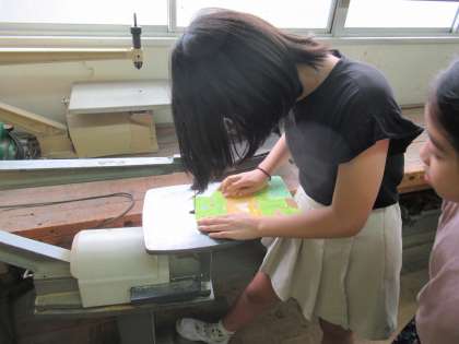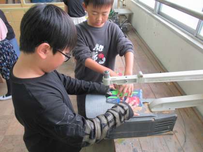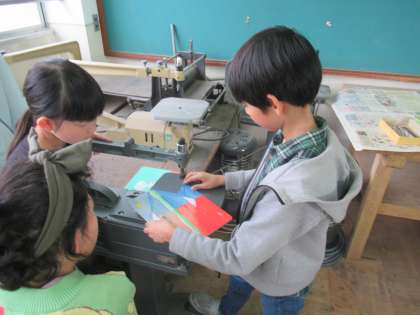 図工室で電動のこぎりを使って切る作業に入って行ってます。