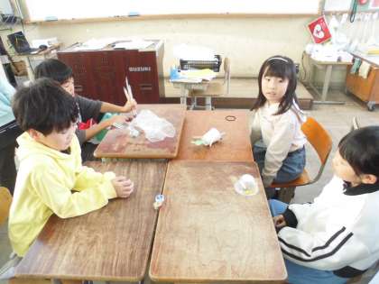 2年生の生活科「あそんで ためして くふうして」の学習で、作ったおもちゃのがんばったところや、工夫したところをグループで話をしました。