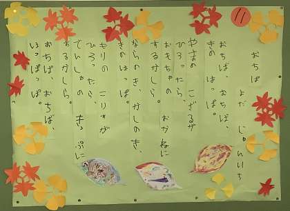 11月の掲示物を教室前に飾りました。「おちば」の詩の周囲に,いちょうともみじの切り紙やイラストを描いた木の葉カードを貼って仕上げました。秋が深まっていく11月です。