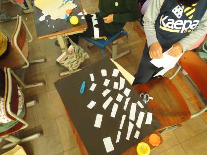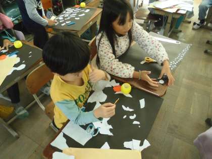 画用紙をはさみで切ってはって何に見えるかを想像しました。