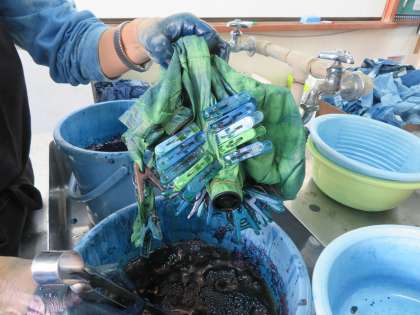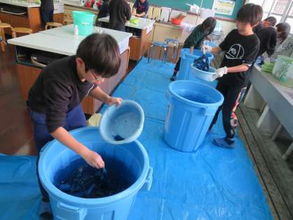 模様が決まると、いよいよ藍染です。先生に染めていただいた後、順番に水や液につけていきました。染まった直後の鞄は緑色になり、子どもたちも驚いていました。「青じゃない!どうして緑なの?」「どうやって青になるの?」そんな話をしながら、どんどん染まっていく鞄に、目をキラキラさせていました。