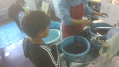 一人一人が無地のマイバッグを藍で染めてもらい、何度もすすぎ洗いをしました。