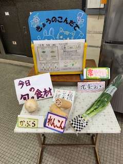 教室では、「鶏肉とれんこんのてり煮」が新献立だと聞いて、いつもに増して味わって食べていました。いろいろな具が入っていて、また餡がよくからんでいて美味しそうに食べていました。