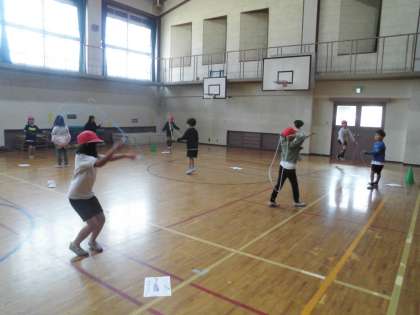 2年生の体育科「なわとび ゆっくりかけ足」の学習では、いろいろな技の練習をしています。友達と教え合って、アドバイスをし合いながら取り組んでいます。