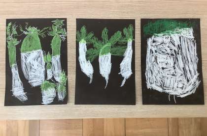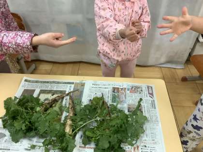 年明けに楽しみにしていた大根の2回目の収穫を行いました。じゃんけんで持ち帰る大根を気持ち良く決めました。大根の収穫を通して、長さを測ったり絵を描いたりして学びが広がっています。