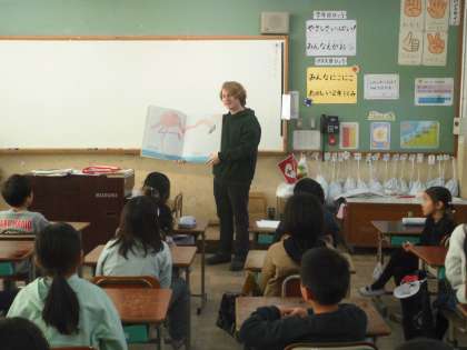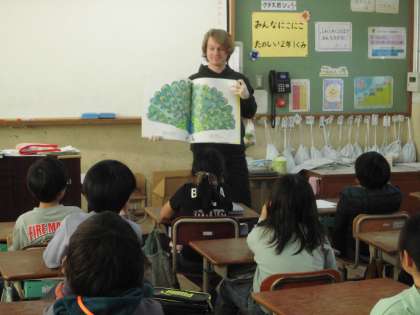 2年生の英語活動では、ALTの先生に、英語の絵本を読んでもらいました。ライオンやカバや、フラミンゴなどたくさんの動物が出てきて、楽しんで聞いていました。