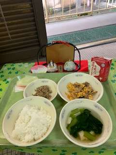 給食では、「ちらしずし」を食べてお祝いしました。京都府の丹後地方では、ちらしずしにさばそぼろをのせた「ばらずし」を食べる習慣があります。