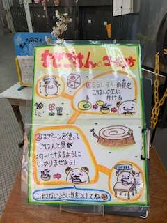 ちらしずしの具は、スプーンを使って各自がごはんに混ぜ、その上に「さばそぼろ」をのせて食べます。ちらしずしの具とごはんを混ぜやすいようにスプーンをつけていますが、食べる時は、お箸を使ってたべるように子どもたちに話しました。