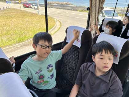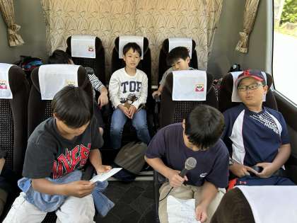 あすたむらんどの移動中に中型バスでは「言葉クイズ」をしました。