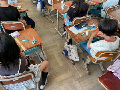 折り紙を2cmごとの長さで切り分け、輪飾を作りました。