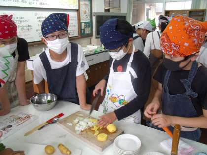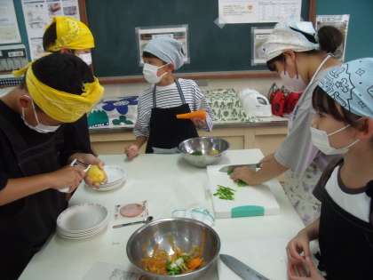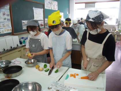 野菜の切り方や炒め方など学習したことを思い出しながら行います。人参や玉ねぎを薄く切るのは難しかったようですが、どの班も上手に切っていました。