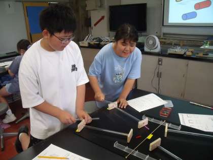 最後はガラス管に通したモールをより速く動かす実験です。振動の強弱や揺れの大きさの違いから進み方の違いを比べ、結論を導きました。楽しい実験をたくさんできて、みんな大満足の時間でした。