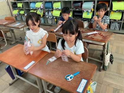 リボンを結ぶのがなかなか難しかったのですが、助け合いながら頑張りました。