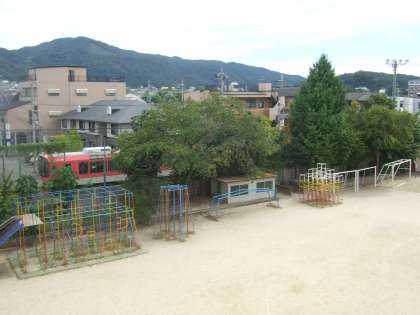 9月14日(月)に,大文字山をバックにしたサクラ(ソメイヨシノ)の写真を中校舎3階より撮影しました。本校の横を走る叡山電鉄きらら号とともに撮影しました。定点観測として写真を掲載します。(写真右上・画像2)