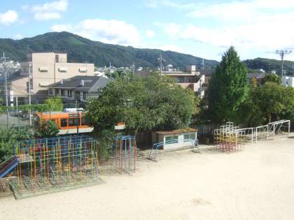 10月8日(木)に,大文字山をバックにしたサクラ(ソメイヨシノ)の写真を中校舎3階より撮影しました。本校の横を走る叡山電鉄きらら号とともに撮影しました。定点観測として写真を掲載します。(写真右上・画像2)