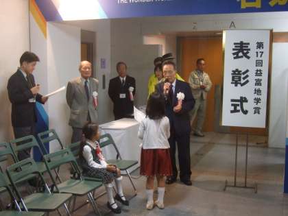 10月10日(土)9時30分より,第17回『益富地学賞』表彰式が,京都市勧業館「みやこめっせ」で行われました。第21回石ふしぎ大発見展の<京都ショー>オープニングにて行われました。本校からは,『さいしゅうノートとひょうほん』を作成した児童が銀賞に,『貝の化石のはっくつ』を作成した児童が努力賞に選ばれました。(8名の入賞者のうち,2名が本校児童でした。)よくがんばりました。