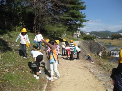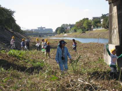 10月21日(水)2・3校時に,1年生が生活科の学習で,高野川へ秋みつけに行きました。河原の草むらでバッタやイナゴ・カマキリなどの虫をみつけて,つかまえました。川の中をのぞいてみると,カワムツなどの魚やサワガニなどを見つけました。コスモスやドングリなどもみつけました。少し落ち葉も見つけました。