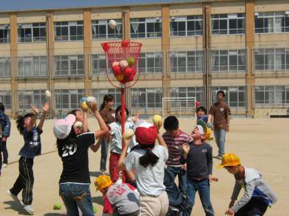 4月11日(土)9:30〜12:00に,4月のおもしろ大百科を行いました。佛教大学サークル「わんぱくグループどろんこ」と一緒に,玉入れ・つなひきやリレーなどをしました。