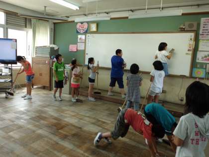 写真は、新しい教科書を配られて見ている様子と、協力し合って大掃