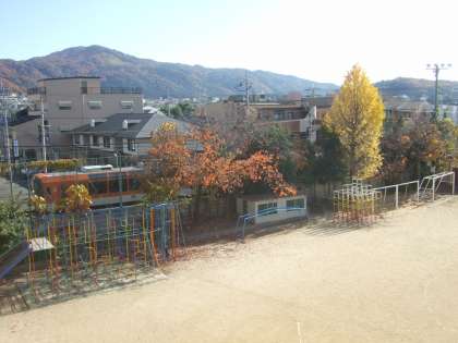 12月2日(水)に,大文字山をバックにしたサクラ(ソメイヨシノ)の写真を中校舎3階より撮影しました。本校の横を走る叡山電鉄きらら号とともに撮影しました。定点観測として写真を掲載します。(写真右上・画像2)