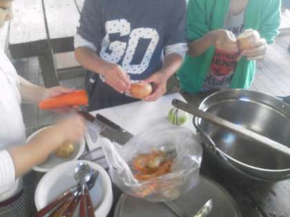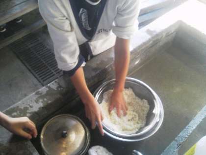 野菜担当は一生懸命皮をむき,ごはん担当は冷たい水でがんばってお米をとぎました。