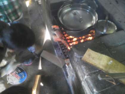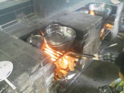 かまど担当の人が上手にまきを組み,火をおこしました。カレーとごはんの鍋をセットして,火加減を調節しました。