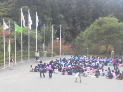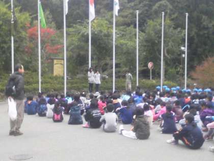 2日目の朝は風が強く,雲がどんどん流れていく少し荒れた天候です。朝の集いでは,上手に学校紹介をし,違う学校の友達と交流を深めました。