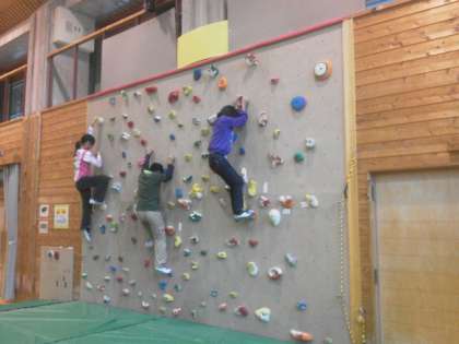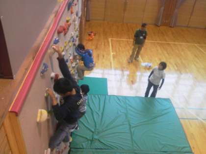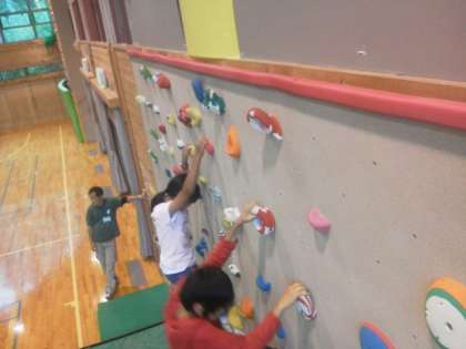 午後からの活動はボルダリングという壁を登っていく運動をしました。上の赤いラインをタッチするまでがんばって登りましたどこに足をかけ,どこを持つのか考えてボルダリングを楽しみました。制覇できて大満足でした。