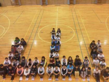 プレイホールで遊びました。友達とバレーボールやバスケットボールをしたり,グループ対抗でリレーをしたりしました。その後,全員で人文字をつくりました。