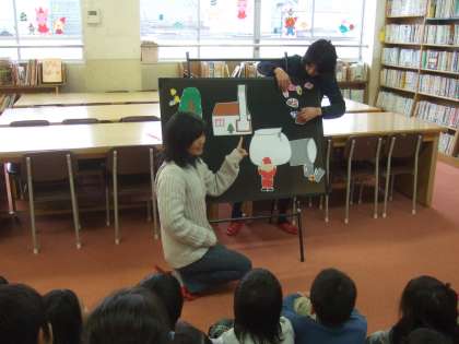 12月10日(木)に,PTA子どもと本の会主催の2年生「よんでよんで」がありました。アーノルド・ローベル作/三木卓訳 絵本『ふたりはいつも』・マーガレット・ワイズ・ブラウン著/チャールズ・G・ショー イラスト/よしがみ きょうた翻訳 絵本『きこえるきこえるふゆのおと』・岩崎京子文/二俣英五郎画 絵本『十二支のはじまり』(人形を使って)・ミュージックパネルシアター増田裕子作『サンタクロースの五人兄弟』の読み聞かせがありました。