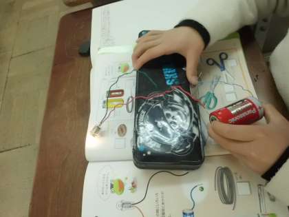 理科の「豆電球にあかりをつけよう」の学習で、どう線以外でも電気を通すかいろいろなものを使って実験をしました。