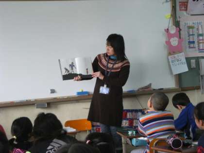 1月20日(水)に,PTA子どもと本の会主催の4年生の「よんでよんで」を朝の読書タイムにしていただきました。齋藤隆介・作/滝平二郎・絵『ソメコとオニ』の読み聞かせをしていただきました。五歳の女の子・ソメコはあそびざかり。オニにさらわれてもこわがるどころか,あそびのさいそく。こまりはてたおには…。