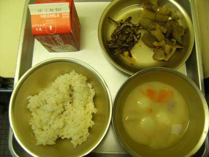 今日の献立『麦ごはん・牛乳・煮しめ・ごまめ・ぞう煮風みそ汁』