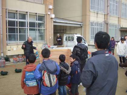 1月23日(土)もちつき大会に先立ち,「さきょう・ふれあい 平和・希望の灯」で,もち米を蒸す時に使う火の点火式を行いました。