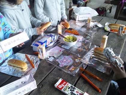 カレー味のキャベツと魚肉ソーセージをパンにはさみます。