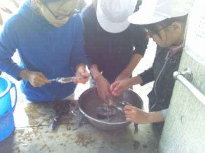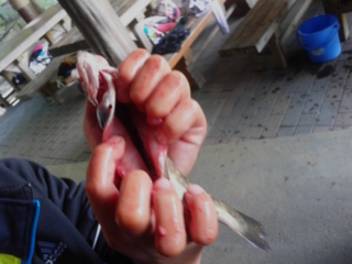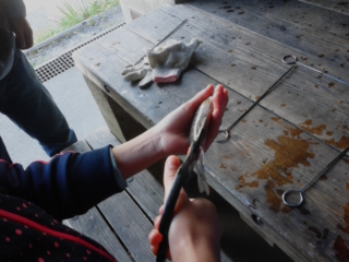 お腹を開き,串に刺していきました。途中で逃げ出してしまうイワナにびっくりしながらがんばりました。