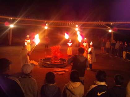 「知恵」「正義自由」「情熱友情」「希望愛」の4つの火を養徳の子どもたちにくださり,ファイヤー点火。