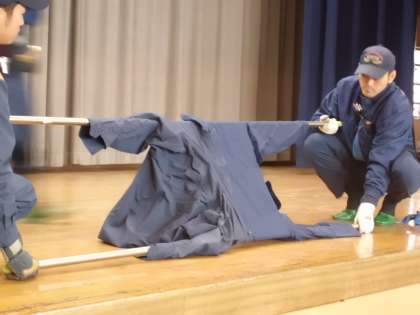 物干し竿に服を通して担架を作りました。洋服だけでも意外に丈夫な担架になりました。