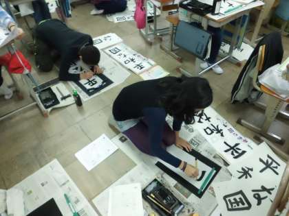 5年2組の習字の授業では,「平和な国」の書きぞめをしました。1つ1つのバランスに気をつけて書くのが難しかったです。クラスには字のきれいな人がたくさんいます。