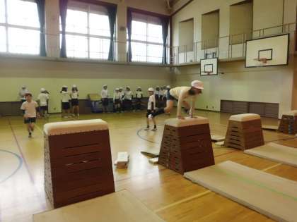 体育では,とび箱を学習しました。5年生では高さや距離のほかに,高度な技にも挑戦していて,台上前転やかかええとびなどの技にも挑戦しました。