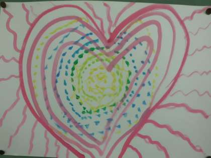 図工では気持ちを表す形や色の授業をしました。怒りやうれしさ,楽しさ,悲しみなどの感情が表されています。自分の思っている気持ちを,いろいろな道具を使って絵で表しました。