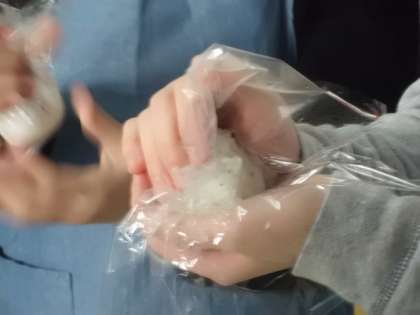 2月19日の本番では,みんないろいろな食材を持ってきて,教科書を見ながら友達と協力して味噌汁を作っていました。また,炊いたお米でおにぎりを作りました。おにぎりの具はゆかりや昆布,のり,梅干しが出ました。