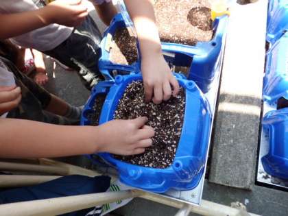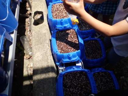 5月12日。待ちに待った朝顔の種まき!子どもたちは,指で穴をあけて,そうっと種を蒔いていました。蒔いた後は,持ってきたペットボトルを使って水やりをしました。芽が出るのが楽しみです。