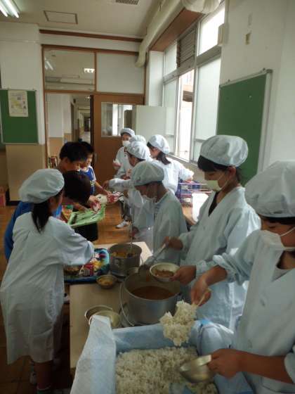 教室では当番が配膳してくれますが,ランチルームでは一人一人が自分の給食をもらいに行きます。