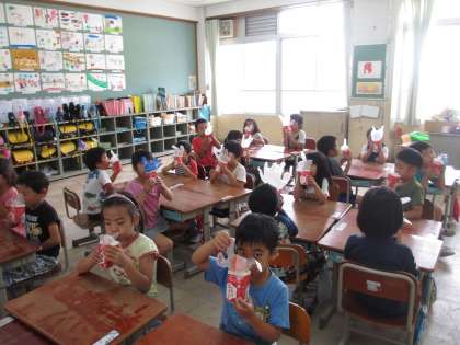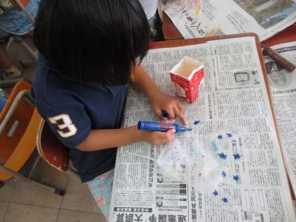 今日の図工は牛乳パック・ストロー・手袋を使った飛び出すおもちゃを作りました。