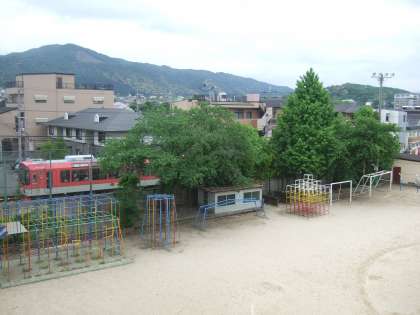 5月8日(金)に,大文字山をバックにしたサクラ(ソメイヨシノ)の写真を中校舎3階より撮影しました。本校の横を走る叡山電鉄きらら号とともに撮影しました。定点観測として写真を掲載します。新緑がとてもきれいです。(写真右上・画像2)