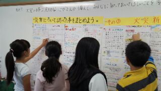 総合的な学習の時間では,引き続き防災について学習を進めています。けむりハウス体験の後から火災について調べてきたことを壁新聞にしてまとめました。今日は各班で交流をし,気付いたことやわかったことを伝え合いました。